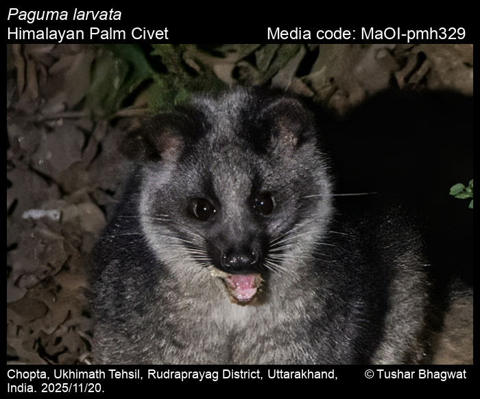 Anonymous 2026. Paguma larvata C. E. H. Smith, 1827 – Himalayan Palm Civet. In Bayani, A., R. Chakravarty, and K. Kunte (Editors) (Chief Editors). Butterflies of India, v. 1.13. Published by the Indian Foundation for Butterflies. URL: https://www.mammalsofindia.org/paguma-larvata, accessed 2026/01/06.