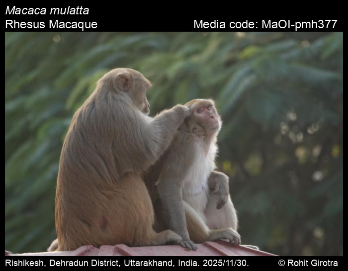 Anonymous 2026. Macaca mulatta Zimmermann, 1780 – Rhesus Macaque. In Bayani, A., R. Chakravarty, and K. Kunte (Editors) (Chief Editors). Butterflies of India, v. 1.13. Published by the Indian Foundation for Butterflies. URL: https://www.mammalsofindia.org/macaca-mulatta, accessed 2026/01/31.